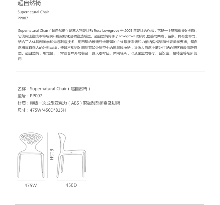 "Supernatural Chair(超自然椅)是意大利设计师Ross Lovegrove于2005年设计的作品,它是一个非常重要的创新,它使用注塑技术将玻璃纤维聚脂化合物塑造成型。这张新式的可层叠的椅子代表着新的视觉形式,数字化的生成,在它被使用的每一天都能感觉到,纤细的、活泼的、有益于健康。超自然椅传承了Lovegrove的有机性感的曲线,苗条、具有生命力。结合了人体解剖美学和先进制造技术,用两层的玻璃纤维增强的PM聚胺来调和内部结构框架和外表美学要求。超自然椅有着迷人的外形曲线,椅背不规则的圆洞有如外星空中的黑洞般神秘,又像大自然中随处可见的鹅卵石般清新自然,所以超自然椅所显现的气质是那么的与众不同。超自然椅,可堆叠,非常适合在户外的餐会、露天咖啡座、休闲场所,以及居室的餐厅、会议室、接待室等场所使用。"