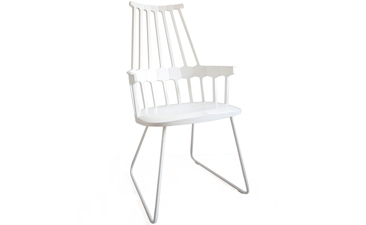 温莎风格椅被冠以乡村风格,但并非一成不变,在不同时期不同阶段又融入新的设计元素。Kartell的这款产品再一次享受重现经典的设计快乐,国际知名家居设计师Patricia Urquiola为温莎椅(Windsor Chair)打造了一个这款新的造型。回归十八世纪英格兰的辉煌时期“梳背”椅的特点,整个框架用亚光材质,靠背的7个分支结构朝着椅腰部位向下延伸,在一个加固六角形圆圈处与纤细的轴汇合,与椅座合为一体。聚碳酸酯材质的使用赋予COMBACK一种轻盈的质感和当代风格。浸透在黑色COMBACK梳背椅里的那一分淡定从容,能让人气定神闲,默默却又不留情面地将浮华虚荣隔在门外。因为不存在彩色光谱里,白色可以说并非真正色彩。纯白色Comback Chair梳背椅,唯美得让人难以抗拒。那种与世无争的清雅,好似刚刚落入凡尘的花瓣,昭示宁静与自然。这款Comback Chair 来自意大利的创新品牌Kartell,以发梳为灵感,回归18世纪英式风格,整齐对称的典雅扮相,表现出一份沉稳内敛的韵韵意涵。木质椅角的运用,让复古气息升华其中。配搭塑料椅身的现代风格特色,不愧为一份跨越历史的新时代作品。荣获2011年Wallpaper设计奖殊荣。