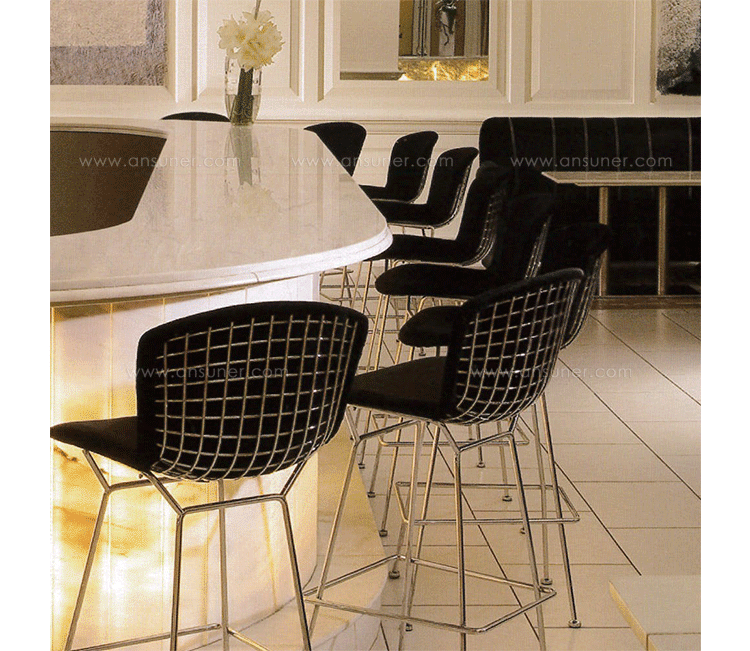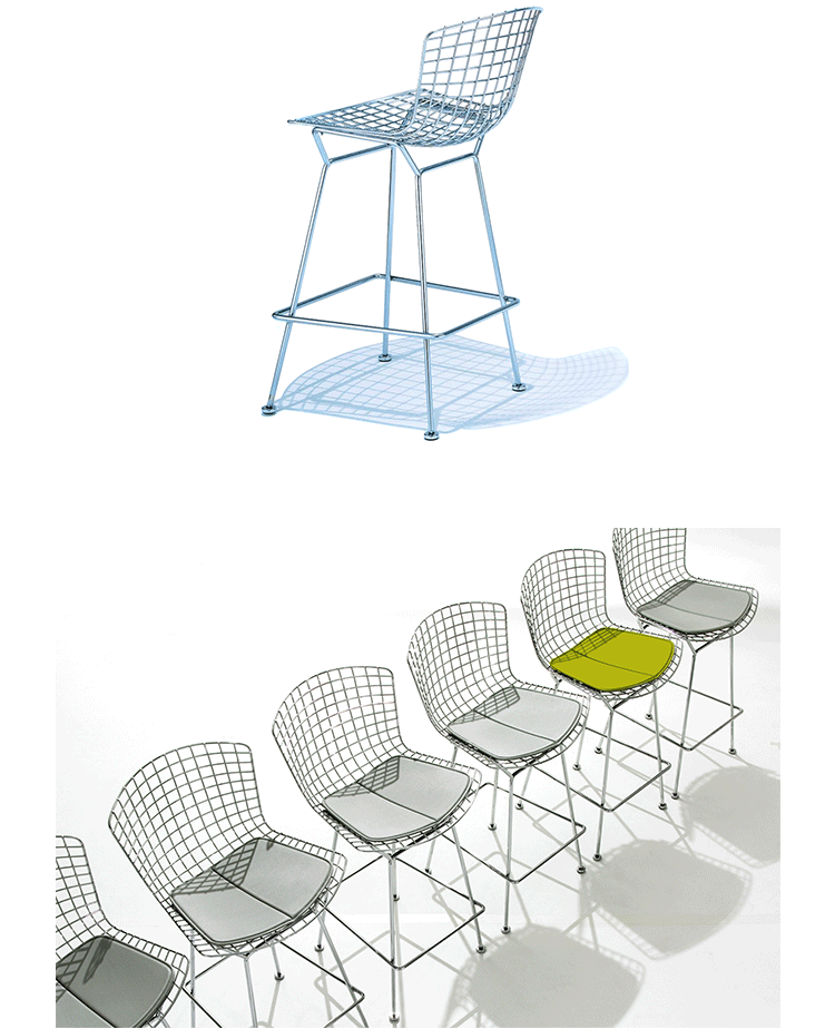 bertoia stool(伯托埃凳)是美国设计师伯托埃设计的,1950年,Harry Bertoia尝试用钢枝制造出结实、轻便而又经济的椅子。1952年,他通过弯曲的金属棒来设计出这张极具创意的伯托埃吧椅(Harry Bertoia Barstool),这张椅子适用与餐厅、酒吧、高档会所等地,利用了金的外形给椅子赋予了现代感,因为生产简单、材料简便,时候大规模的生产,非常适用于商业空间,这或许就是设计的力量可以改变 经济结构吧。