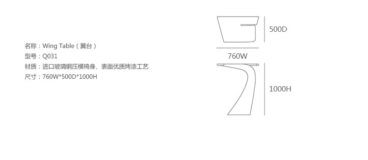 "翼系列包含翼台和翼吧凳,由设计大师oaquín Torres和Rafael Llamazares设计,它造型以一种动态的方式将直线和曲线编织在一起。这些极端曲线和角度,在最新的体系结构中,已经达到了家具设计典范,通过运用自由的、 微妙的、 有机的线条,以运动的形态,分离本身刚度。这些都是大胆的创新,构成了巨大的视觉冲击,令人印象深刻,达到雕塑和动态意义。"