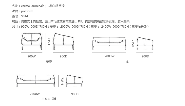 法国建筑师Jean-Marie Massaud设计的Carmel系列家具宽大轻盈。这套沙发包括沙发(两人)、扶手椅和沙发凳,结构采用模压聚氨酯软材料,支腿为铝合金,涂漆或软包皮革。有两种面料选择:无纺布或可拆洗的沙发套和不能拆下的天然皮革。靠背有口袋的沙发椅没有带沙发套的款式。