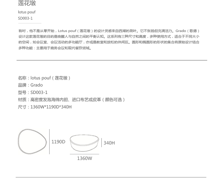 有时,它不是从零开始,Lotus Pouf(莲花墩)的设计灵感来着西湖的荷叶。它不张扬与但充满活力。Grado(歌德)设计这款莲花墩的目的是唤醒人与自然之间平衡的认知。这系列有三种尺寸和高度,多种使用方式,适合于不同大小的空间,如会议室、 会议活动的多功能厅,亦或是教室和放松的休闲区。圆形和椭圆形的形状的集合将原始设计结合多种功能︰主要用于商务会议和现代餐饮领域。莲花墩的制作使用了防霉实木内框架或玻璃钢内胆、高密度海绵、进口布艺或皮革(颜色可选)。