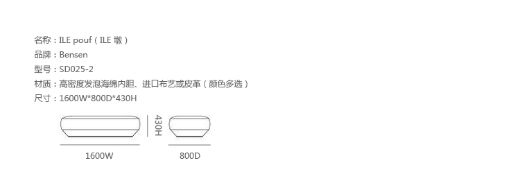 ILE Pouf(ILE 墩)由 Niels Bendtsen设计,像个u形槽,线条简洁流畅,朴实无华做工却十分精细。可贵的是,它不仅仅是用来垫脚,还可以当做座椅。制作采用高密度发泡海绵内胆、进口布艺或皮革(颜色多选),裹面织布(皮革)可拆卸,方便清洗保养。