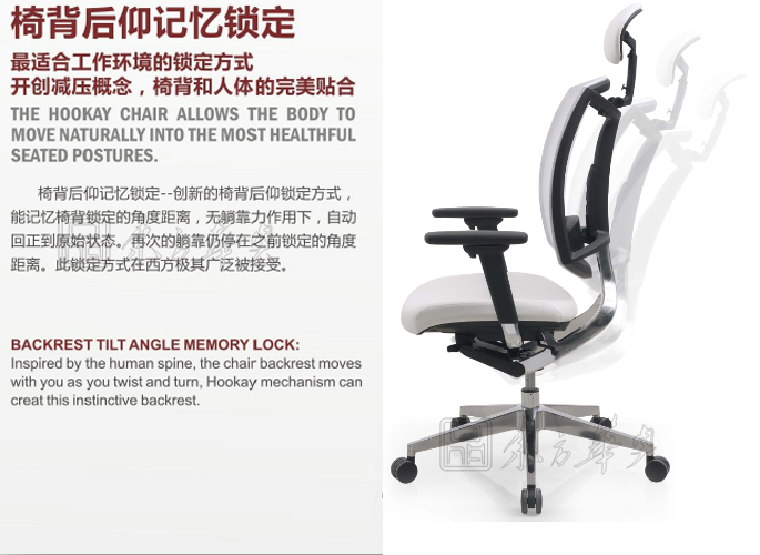 3、背垫: 松紧度调节,可后仰到人体所需的角度后记忆锁定。腰靠:弹力支撑,可支撑人体背部第三节和第四节脊椎,使得长时间工作不会疲劳。