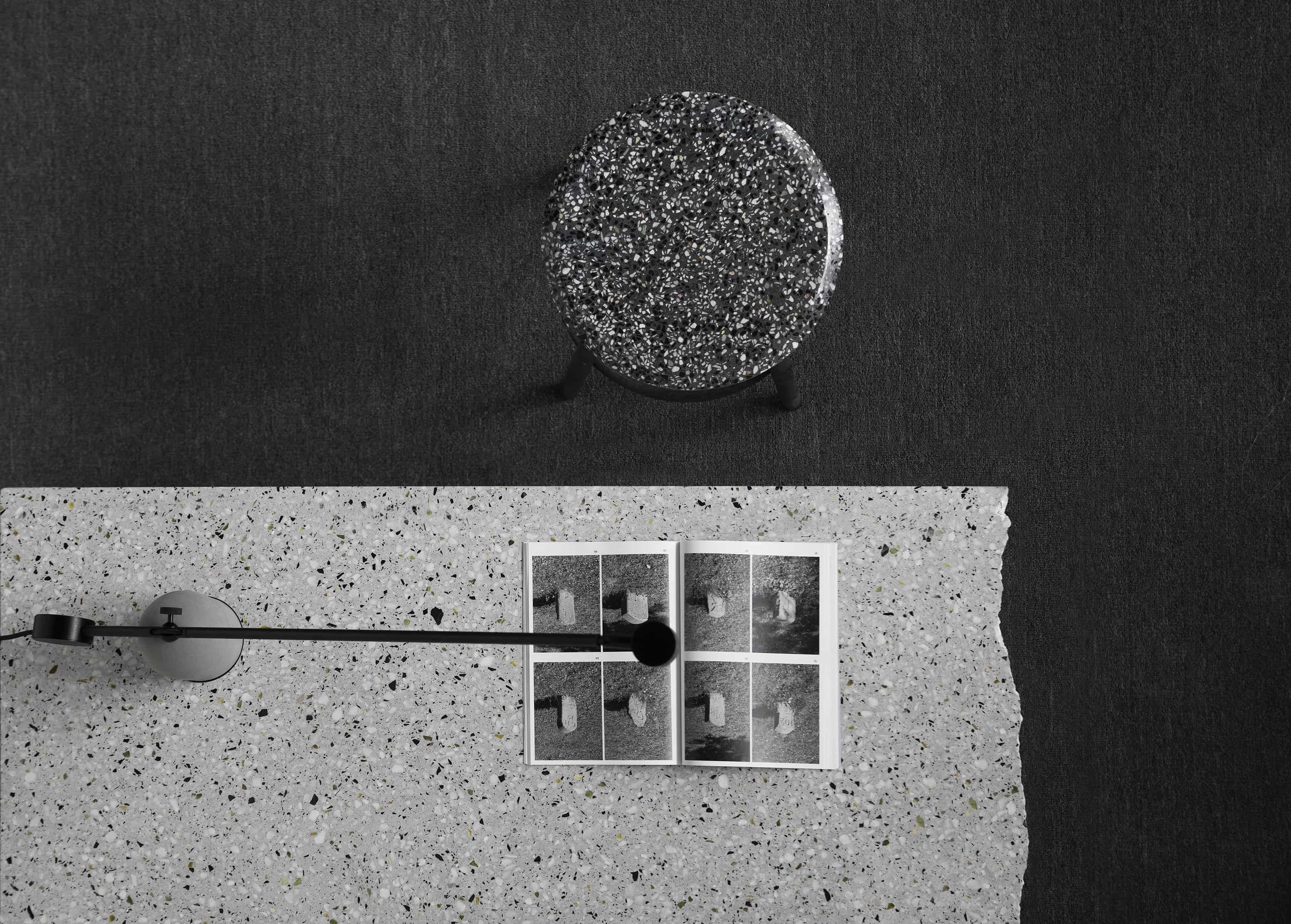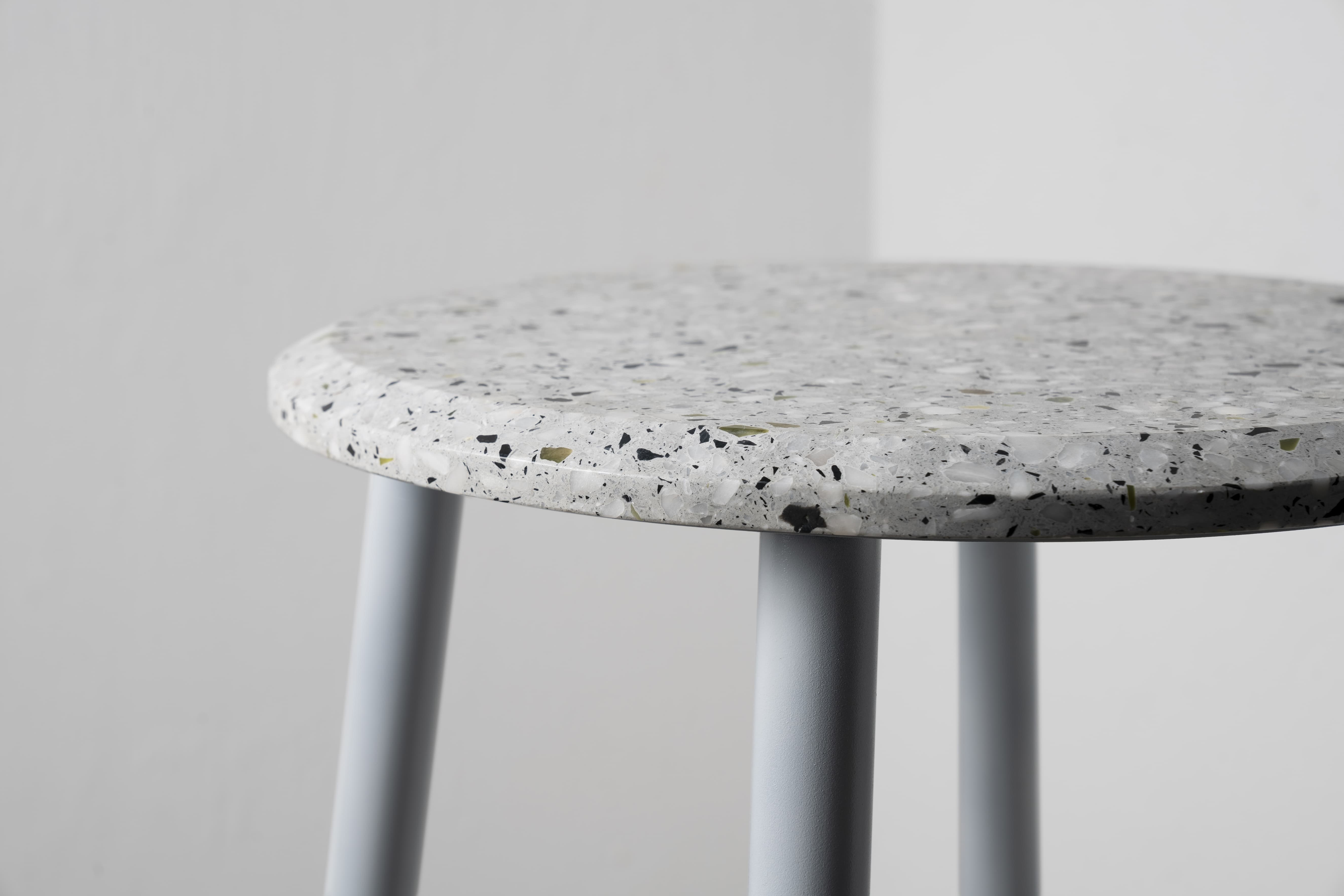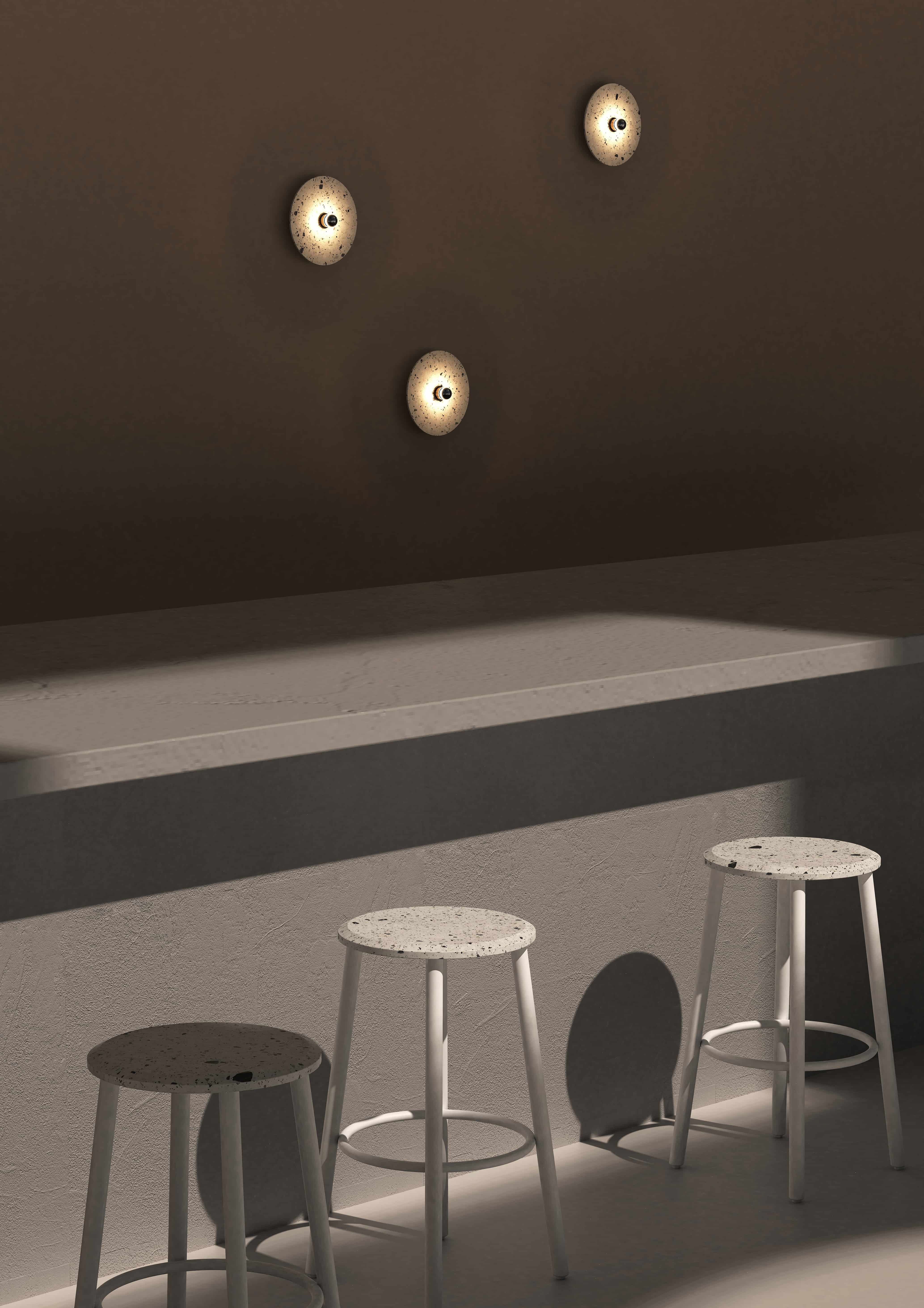 剩余的石材边角料与混凝土混合后打磨,形成经典的水磨石质感,呈现透气自然的机理,是旧时光的记忆。 从水磨石座面到金属腿部保持优雅流畅的圆,对称而恒定,一如你我的日常。 水磨石的复古花纹以摩登利落的风格在当代空间找到新的角色。黑白两种配色选择,给予厨房、咖啡厅、酒吧一种新的视觉可能。