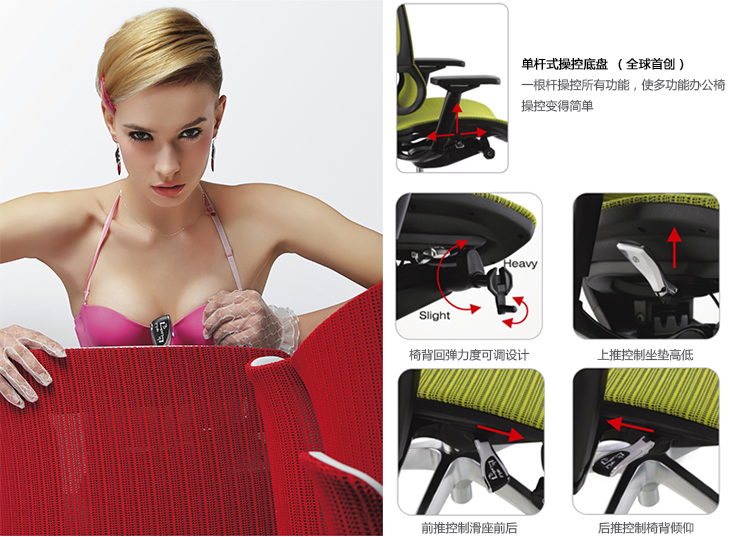 全球首创的单杆式操控底盘,一根杆操控所有功能,使办公椅的操控更加人性化;