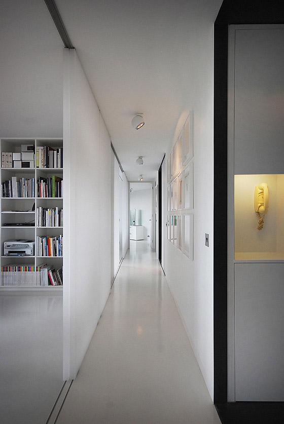 REFURBISHMENT OF A LISTED TOWER APARTMENT The flat is located above the city of London, only a short walk from the financial district amidst a on first sight, rough concrete oasis - the listed Barbican Centre. There is no traffic, instead ponds, gardens and a distinguished cultural centre on the ground level, including a concert hall, theatres, art galleries and cinemas. The 100 m² flat on the 17th floor of the Shakespeare Tower with spectacular view over the roofs of the city shall be the new residence of our client and also serve as an exhibition space. When the client purchased the flat it looked as if it was frozen in time with yellowed carpeting and the original kitchenette, albeit seemingly run down. Nevertheless the flat had a well arranged floor plan, although the corridor, kitchen and bathroom were located towards the inside of the building and therefore appeared dark and small. A Loggia stretches all around the flat. On the east side in front of the kitchen window it forms a terrace which offers unobstructed views over the skyline. From breakfast with the sunrise to an evening sunset it is only a few steps along the balcony. The flat shall become more flexible and spacious while maintaining the historic floor plan. Space for the display of contemporary art shall also be offered. The panoramic view must be visible from all corners of the flat. In order to achieve a greater lightness, the wall between the corridor and bedrooms was replaced by translucent sliding panels. Living rooms are completely coloured in white to underline their spaciousness and to form a minimalistic background for the art collection. In harsh contrast to this, the walls of the internal spaces of the corridor, bathroom and kitchen are coated with a smooth shimmering black cement finish. The dark finish allows small rooms to work larger and adds an elegance with the contrast to the white fixtures. The structure of the flat with its three layers becomes visible: the outside loggia, the white living rooms and the bathroom and kitchen completely wrapped in black. The solid wall between the bathroom and corridor was also removed and replaced by translucent sliding doors. When open, the owner can enjoy the panoramic view while soaking in the bathtub. If the balcony doors are also open, the gentle rumble of the metropolis can also be heard. The Barbican Estate was built between 1965 and 1976, on a site that was bombed in World War II.The complex was designed by the architects Chamberlin, Powell and Bon. The estate was officially opened in 1969 and is now home to around 4,000 people living in 2,014 flats. The flats reflect the widespread use in Britain in the 1960s and 1970s of concrete as the visible face of the building. "The intention underlying our design is to create a coherent residential precinct in which people can live both conveniently and with pleasure. Despite its high density the layout is spacious: the buildings and the space between them are composed in such a way as to create a clear sense of order without monotony. Uninterrupted by road traffic (which is kept separate from pedestrian circulation through and about the neighbourhood) a quiet precinct will be created in which people will be able to move about freely enjoying constantly changing perspectives or terraces, lawns, trees and flowers seen against the background or the new buildings or reflected in the ornamental lake." Chamberlin, Powell & Bon, Architects "Barbican Redevelopment" April 1959