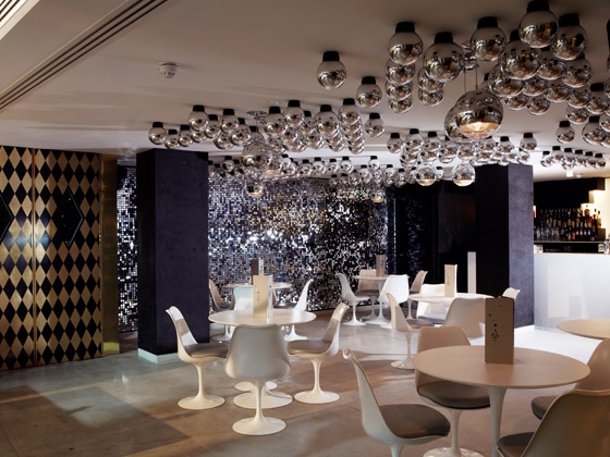 Design Brief Design Research Studio was asked to create a dynamic venue for a new concept in dining. The premise was to create a spectacular atmosphere which combines fine dining with an informal atmosphere, where the customers feel inclined to dance and participate with surprising circus and burlesque performances. The interior was to reflect the ‘circus concept’ within a flexible design. Design Challenges The main challenge was transforming the drinking and dining experience into a simultaneously stimulating entertainment space. This includes a series of flexible design features which allow for a variety of entertainment opportunities. In order to create integrity with the performance aspect of the brief, Design Research Studio referenced the history of the building as the Royal Opera House menagerie. Design Results The surrealist inspired design incorporates a landscaped ceiling of mirrored globes, a kaleidoscopic reception desk and a kinetic, 3d art wall. The bespoke furniture engages and entertains: the main dining table doubles as a stage (which moves to allow for a larger dance floor), the step into the lounge integrates a dance pole, a mirrored WC lobby houses a hidden water-fountain and animal inspired furniture encourage participation and conversation.