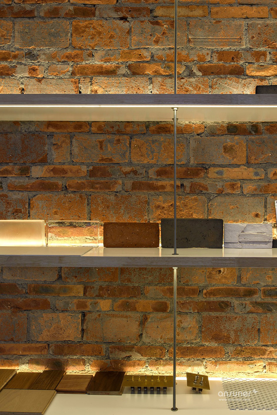 主要材料:超白玻璃、工字钢、橡木、红砖、白色环氧树脂地板、麦秸板