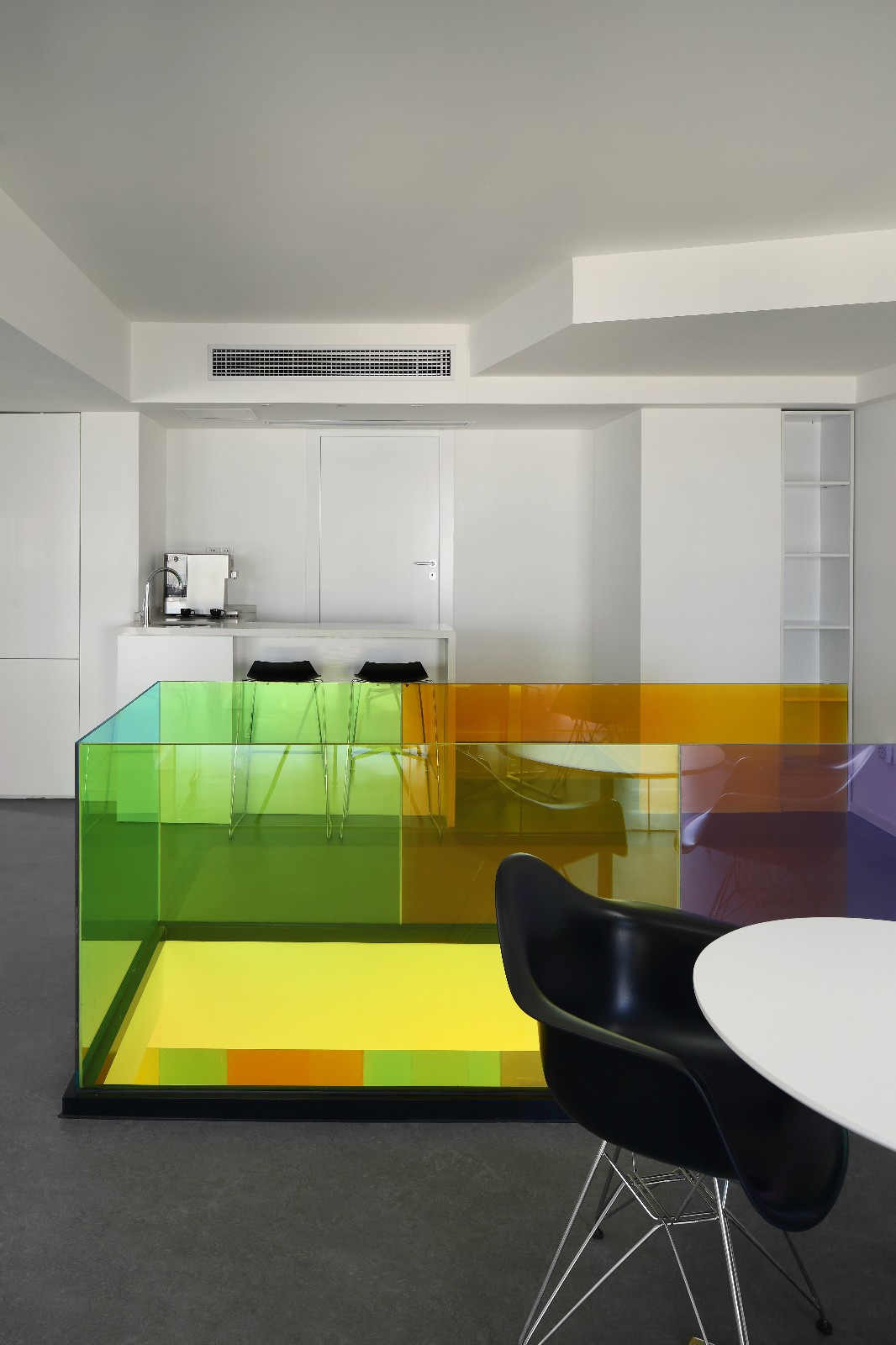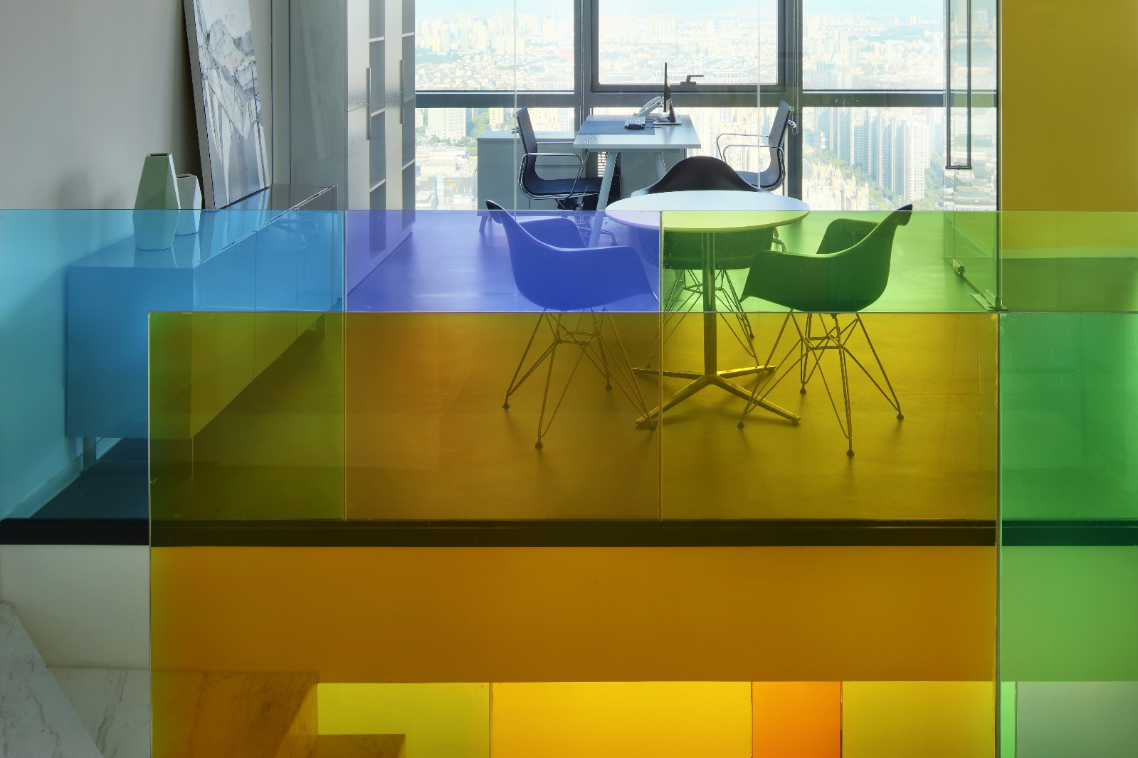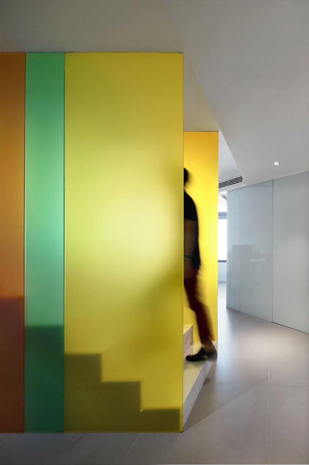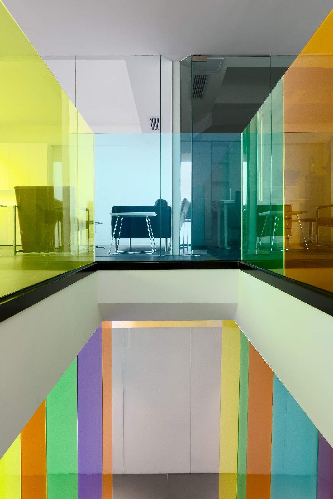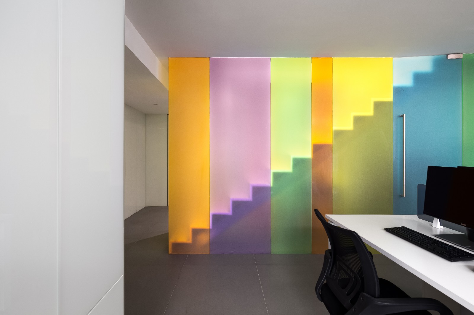继续前进,你会发现一道纯白色大理石架空楼梯嵌于两道“彩虹”之间,一字排开的的楼梯和顶天立地的玻璃形成天然屏风,前台区和员工区自然分割互不干扰。行走上面,似有如梦似幻的感觉,这彩色一直延伸至二楼,并围绕楼梯洞口完成交圈。