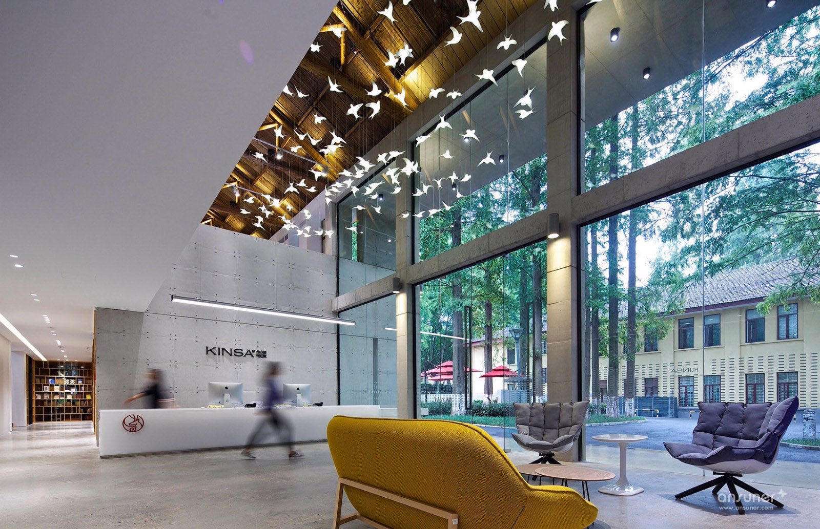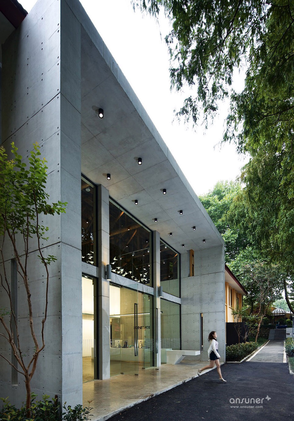 望板上的屋漏痕在诉说着一件件精彩的故事,经历了时间洗礼的望板,仿如一面宋画的绢布背景,若在望板上稍加点缀,寥寥数笔生灵与之交流,便可以形成一幅宋画意向,同时也与项目甲方诉求吻合,整个空间要有家的感觉。燕归巢是对家最贴切的诠释。我们的设计策略是对老建筑的精神延续与衍生,保持原有建筑空间的质量,而不是生猛的冲突。木桁架经过时间的洗礼,斑驳中有时间的印迹,与树脂板建筑材料之间的微妙碰撞,造就了时光交错的印象。我们寻找原来的建筑结构的逻辑,增加剪力墙与柱梁来对原有墙面与屋顶进行加固。同样利用了清水混凝土做结构并摒弃装饰面,让建筑语言之间交流更为流畅。建筑与自然之间的有趣的边界称之为灰空间,建筑的主入口正是这样的模糊边界空间。水杉树庭院与室外庭院,主入口之间形成这种叙事关系。