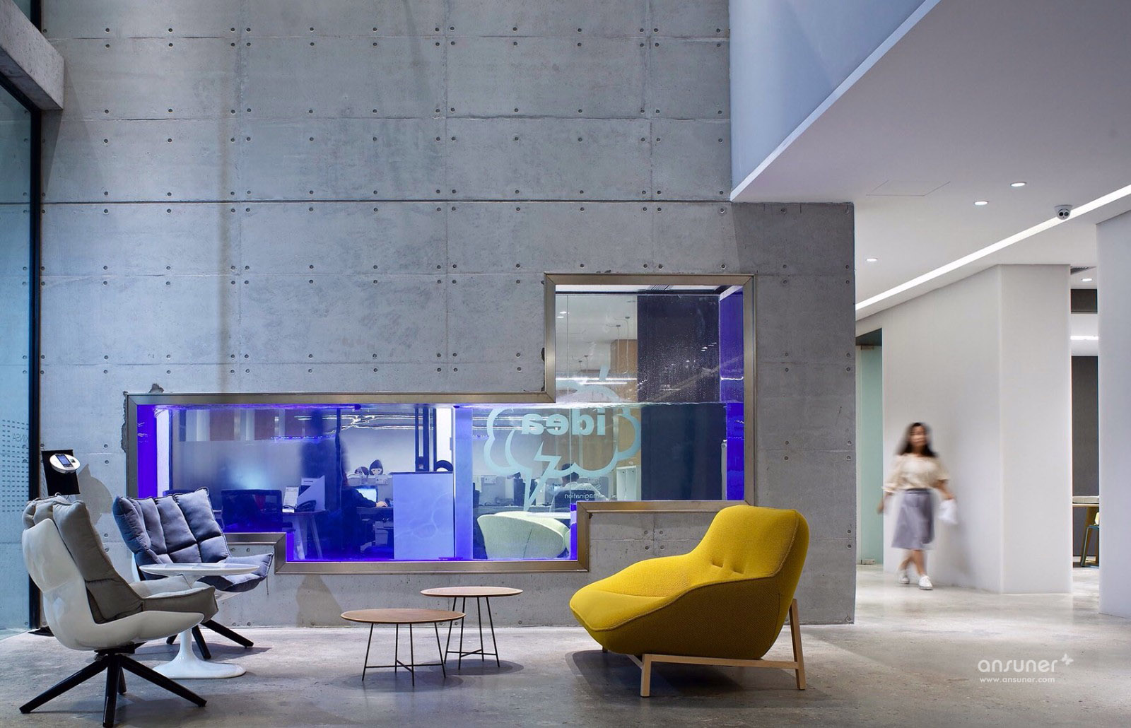 改造项目就是重新建立秩序的过程。在老空间置入微型建筑来重组空间,保持原有空间的质量,从整个建筑的外立面上置入三个空间口,主入口,咖啡厅入口,董事长办公室取景窗,重新组织建筑的空间秩序。为了强调主入口的等级,运用相对厚重的清水混凝土墙来强化。一层大堂挑空区域的材料,是像玉的润度的树脂装饰板,作为室内的主要墙面,组织主要交通空间,是连接一层各个功能空间的纽带。