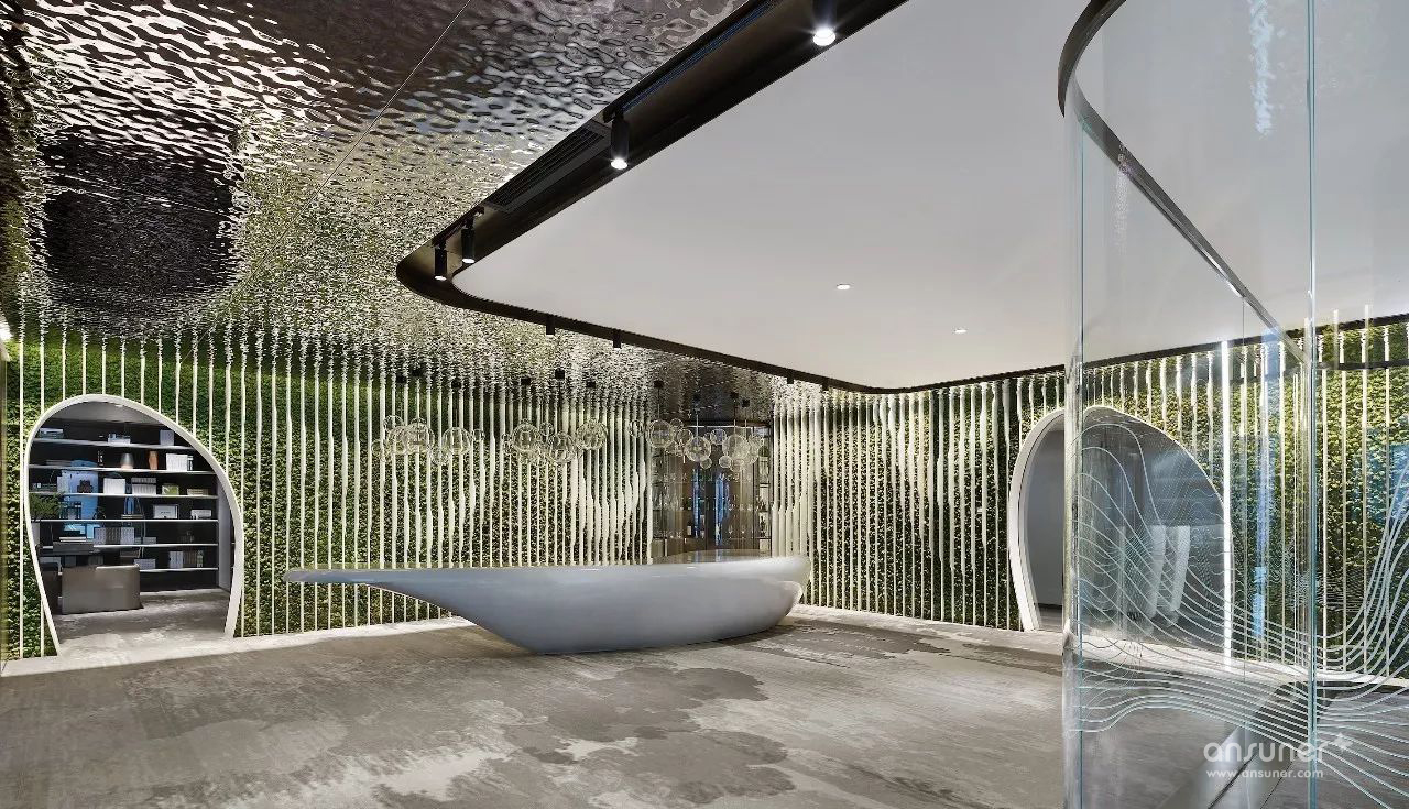 室内设计沿用原建筑设计的“山水城市”概念,配合技术创新,构筑一个都市中的逆世界,天花顶部似水,墙面线型为山,地面像漂浮着的云朵的地毯,融入自然生态美学,打破传统室内空间的固有形态,营造逆空间的独特视觉效果。