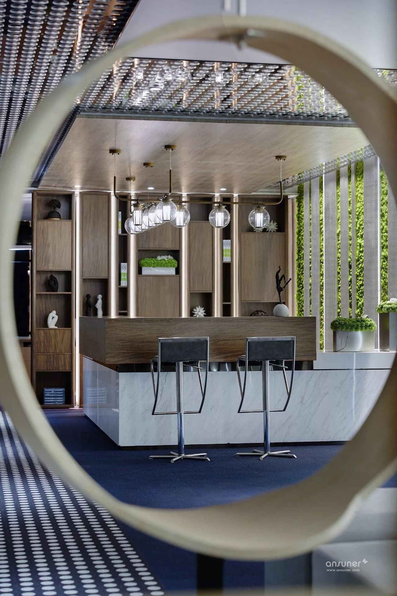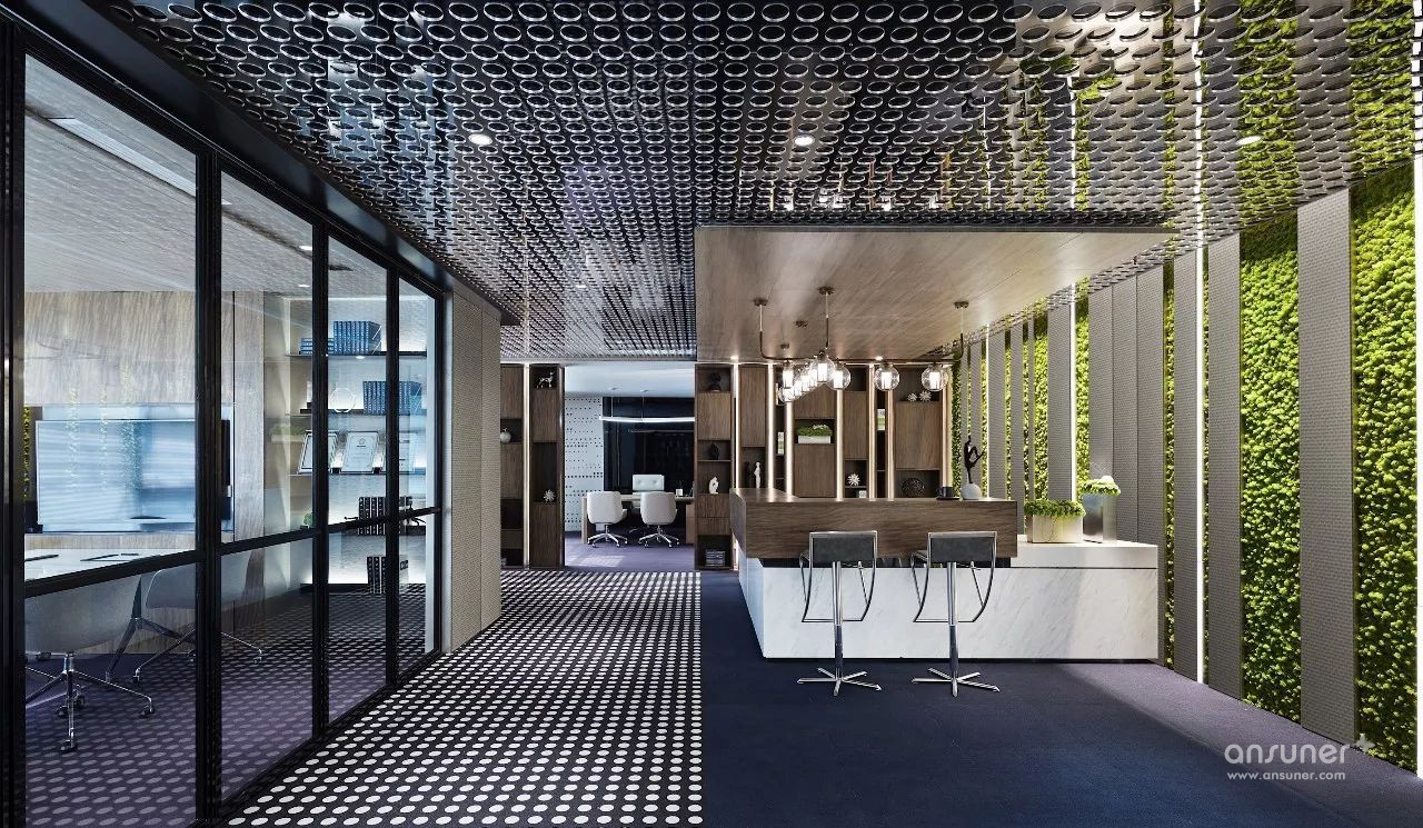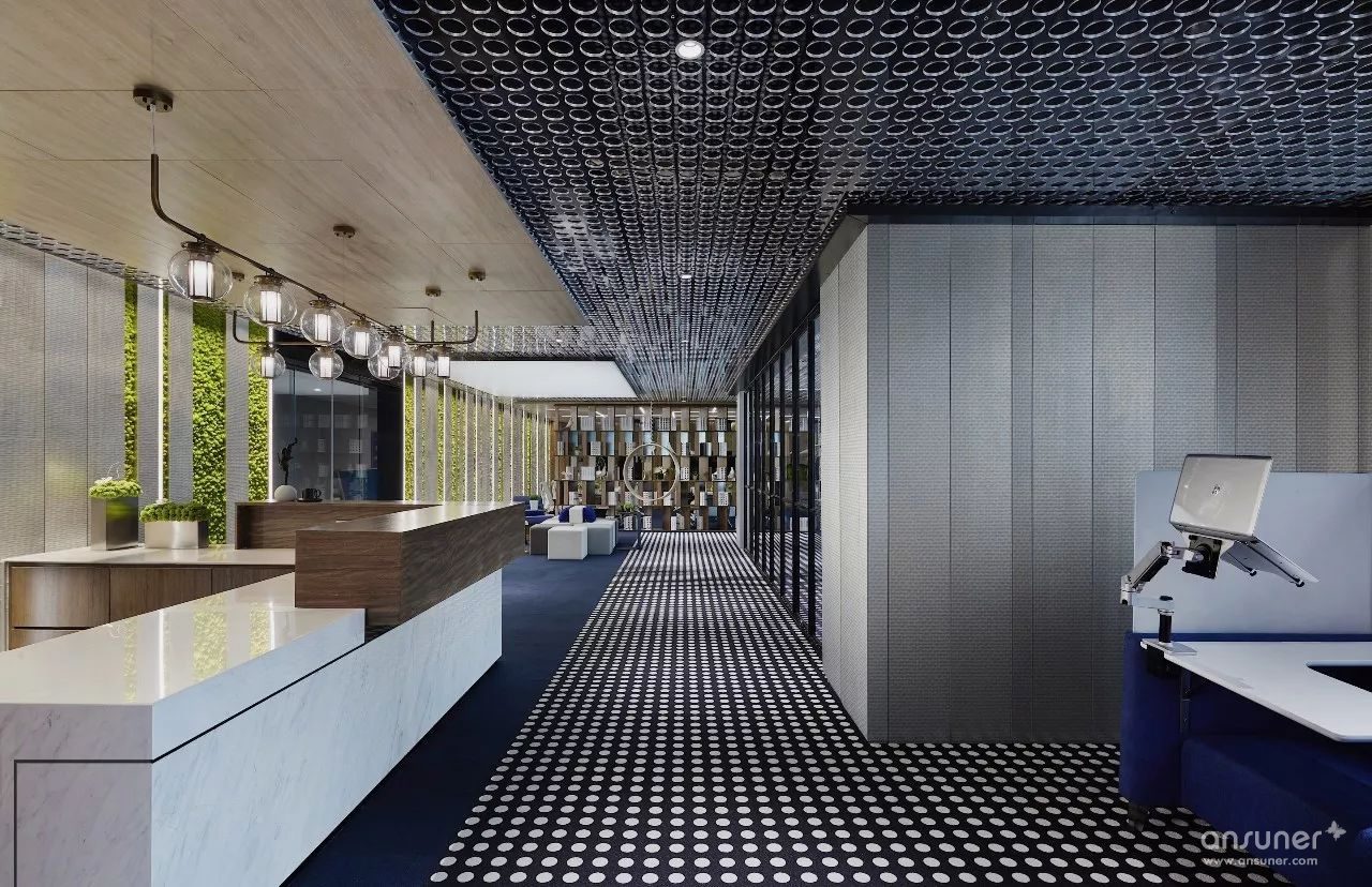 设计师运用石材、金属、木饰面结构穿插的巧妙手法呈现出多功能接待厅、接待台、水吧区的现代感与创新性 。