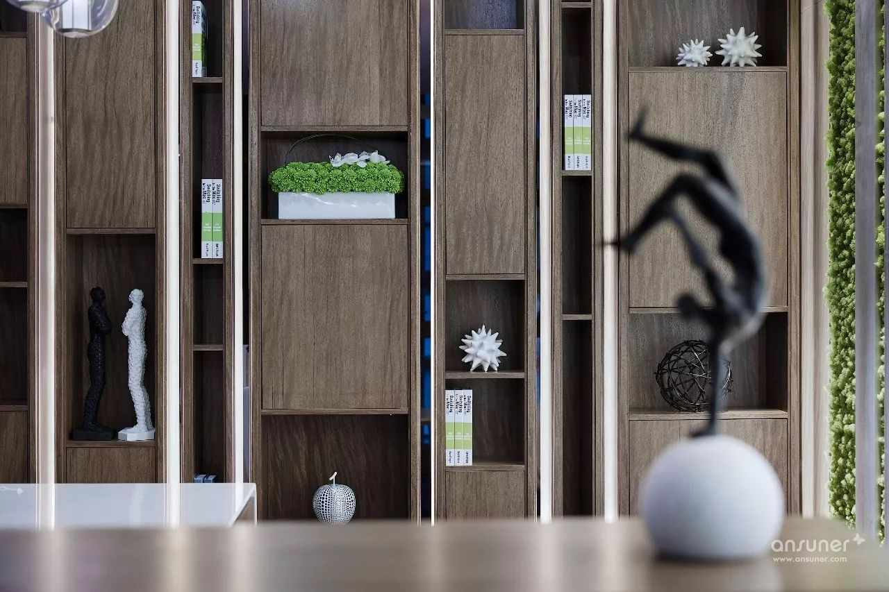 经理室区域独立,让商务洽谈更具私密性。空间运用点线面构成概念,办公区利用书柜分隔,既做到了空间上的划分,又可通过展示柜内陈设呈现个人雅兴,体现个人品位。
