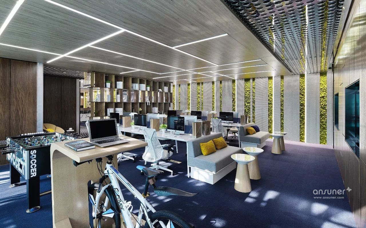 工位设计在临窗位置,光照充足,植入创新理念,多个可灵活讨论的开放空间。健康工位和多功能氧仓的结合,更关注员工的身心健康与工作的舒适度,体现设计师对人性的关怀。