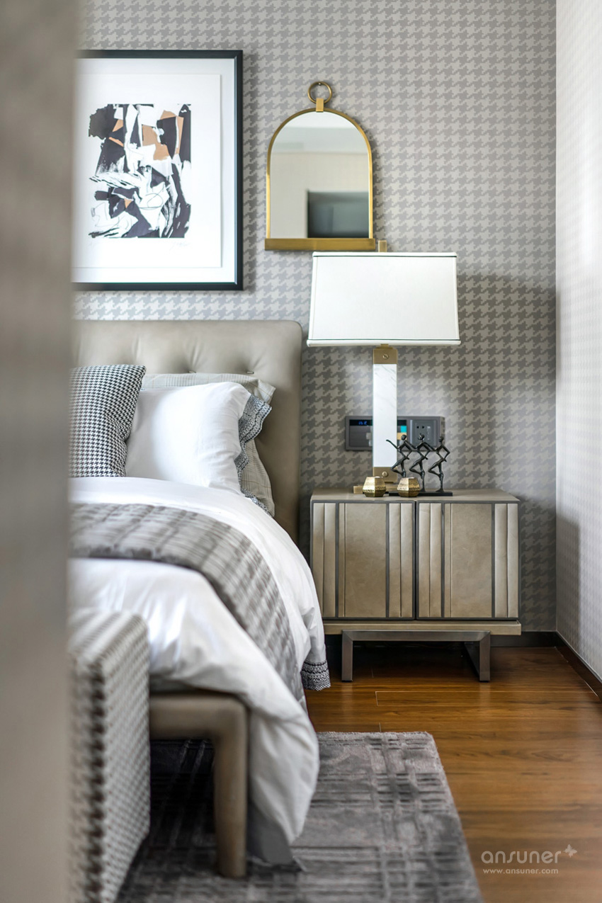 设计师利用对色彩的敏锐视角,以做旧的古罗马灰为主色调表达了主卧空间的优雅和感性,独具风情的格纹地毯,工艺精细的斗柜,艺术装饰画和精心布置的装饰品,让空间有着不同韵律的过渡。